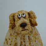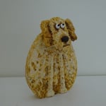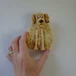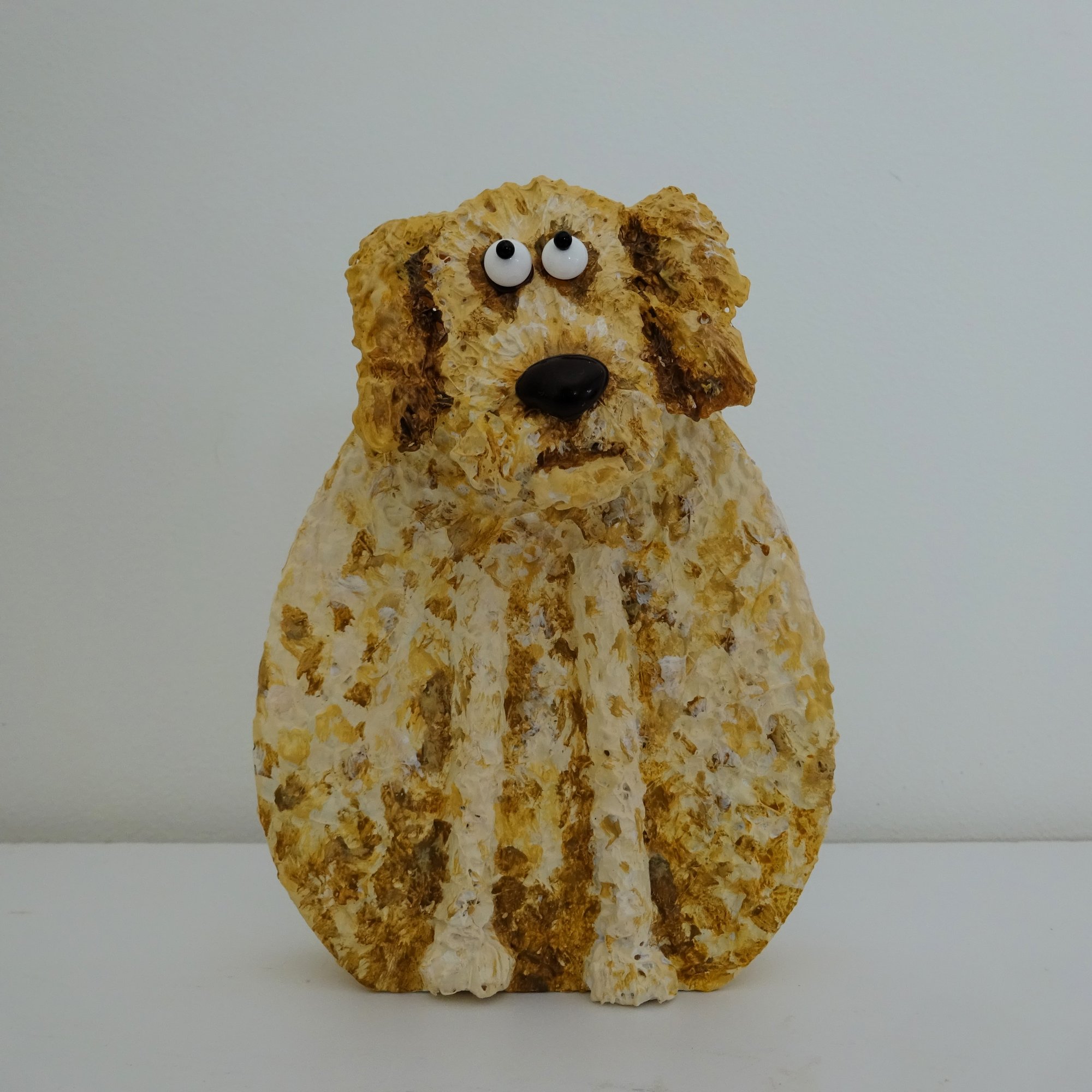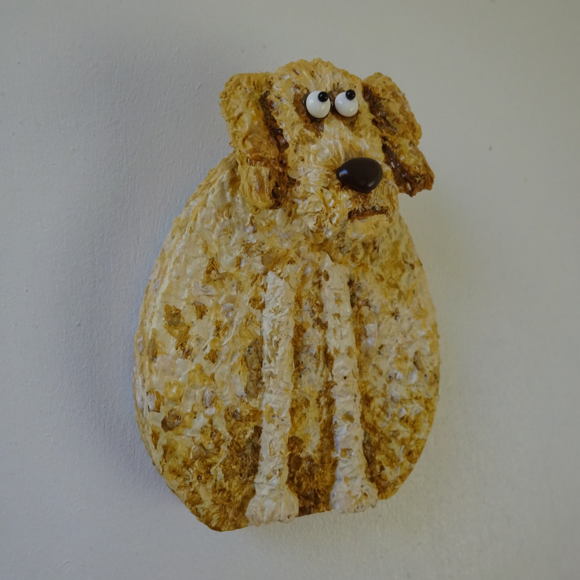 This freestanding dog has a wooden body and a sculpted head on a spring so it nods and wobbles. I've added lots of texture (fur) and hand painted the sculpture with acrylic paint. The 3D eyes give a humorous look to the piece and a keyhole hanger on the back means that you have the option to display it on your walls.
