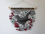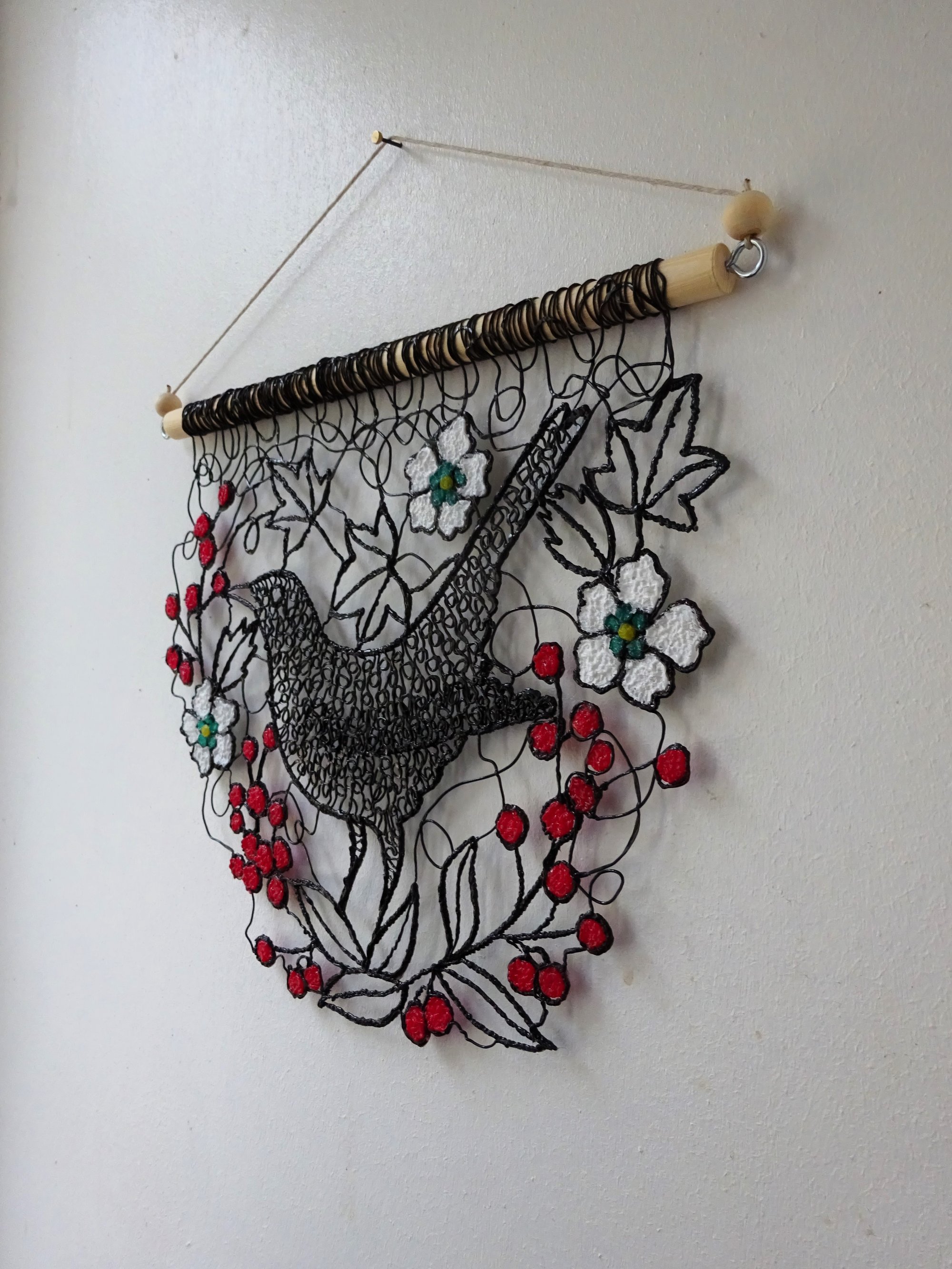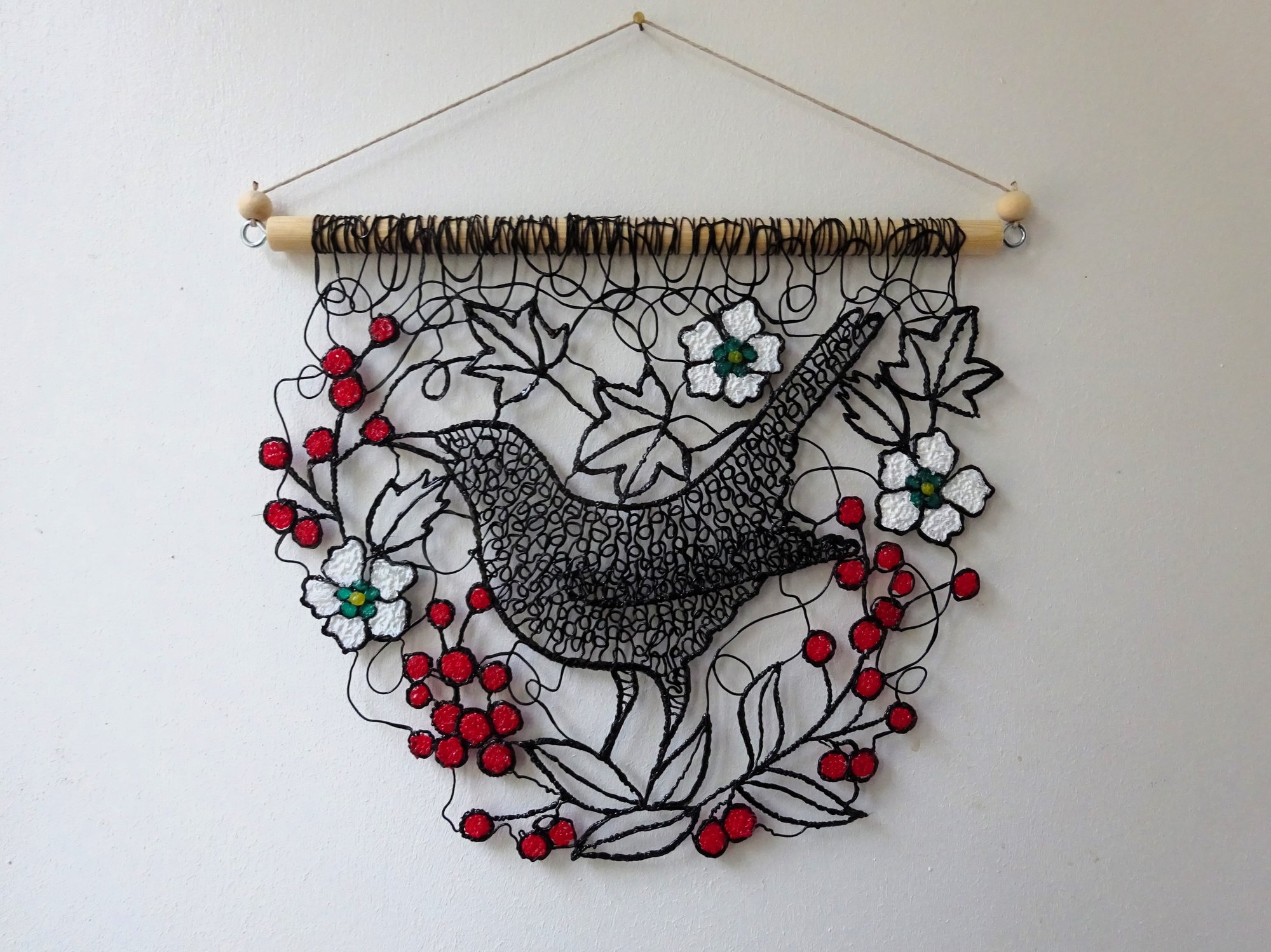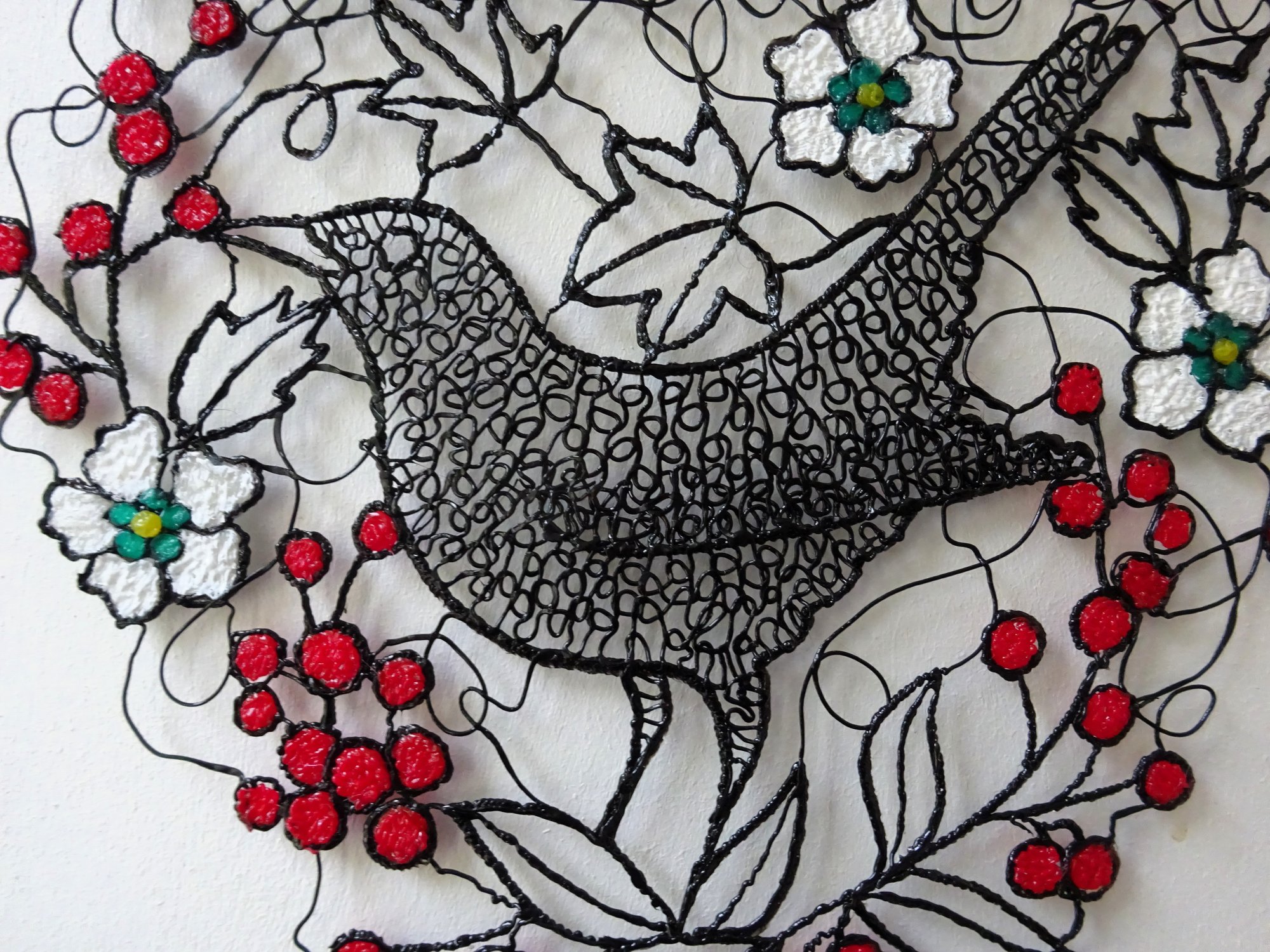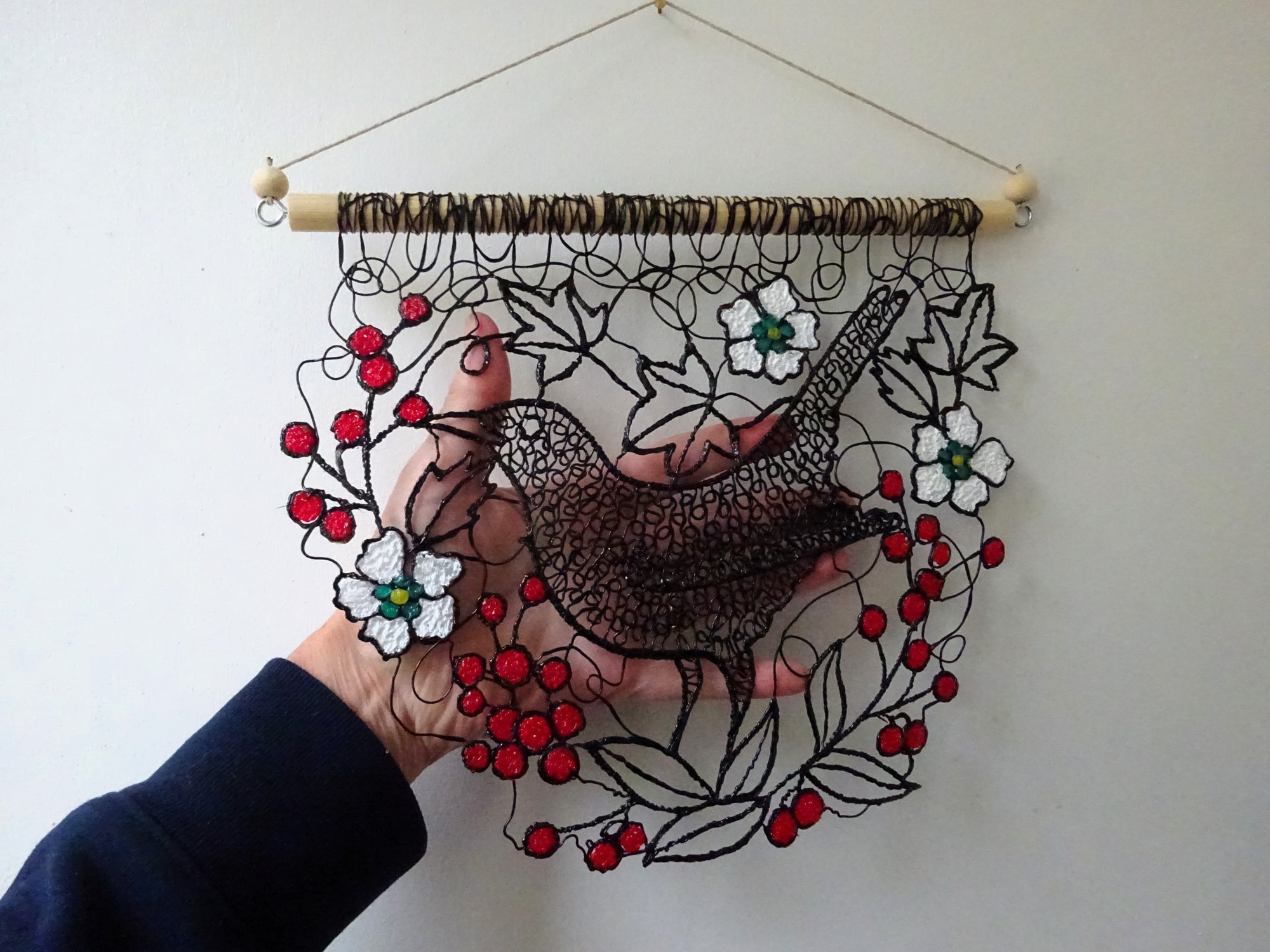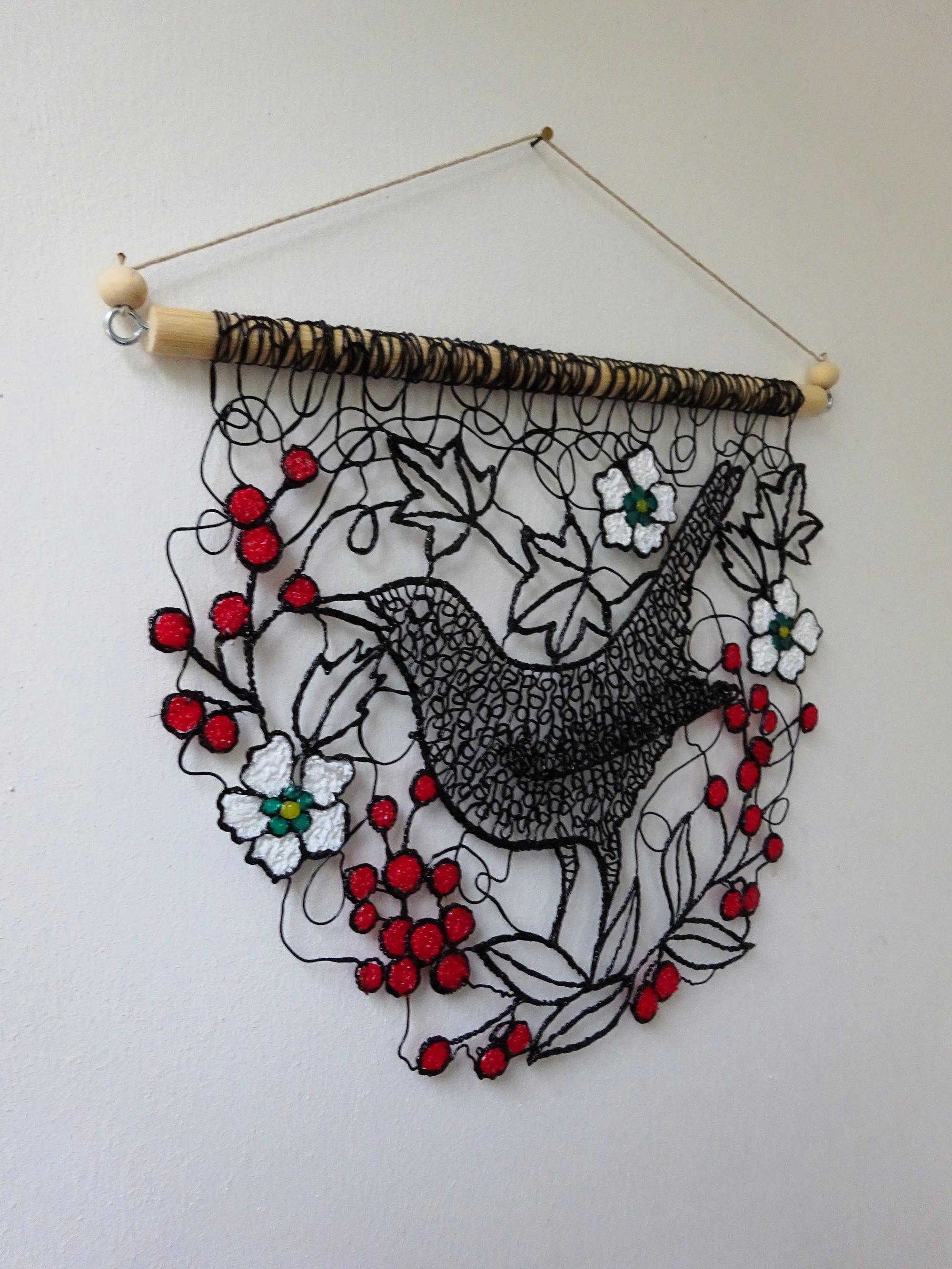 This small wall hanging featuring a handsome blackbird with berries was created with a 3d pen and flexible TPU filament. Drawing with a 3d pen is literally drawing with a rubber-like plastic.