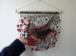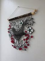 The artwork hangs beautifully from a piece of wooden dowel which measures 28cm. From top to bottom it measures 23cm.