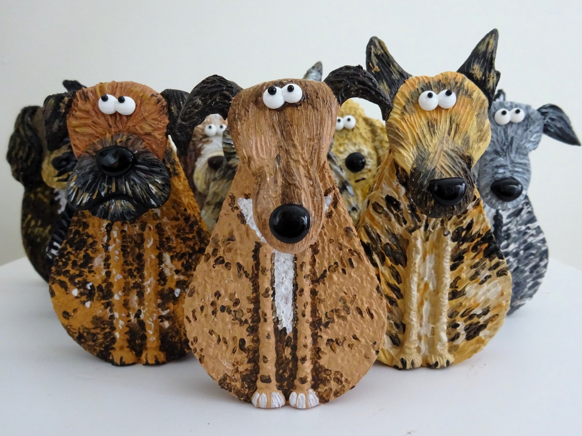 This freestanding delightful dog has a wooden body and a sculpted head on a spring so it nods and wobbles. I've added lots of texture (fur) and hand painted the sculpture with acrylic paint. The 3D eyes give a humorous look to the piece and a keyhole hanger on the back means that you have the option to display it on your walls.