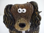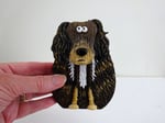 This freestanding delightful dog has a wooden body and a sculpted head on a spring so it nods and wobbles. I've added lots of texture (fur) and hand painted the sculpture with acrylic paint. The 3D eyes give a humorous look to the piece and a keyhole hanger on the back means that you have the option to display it on your walls.