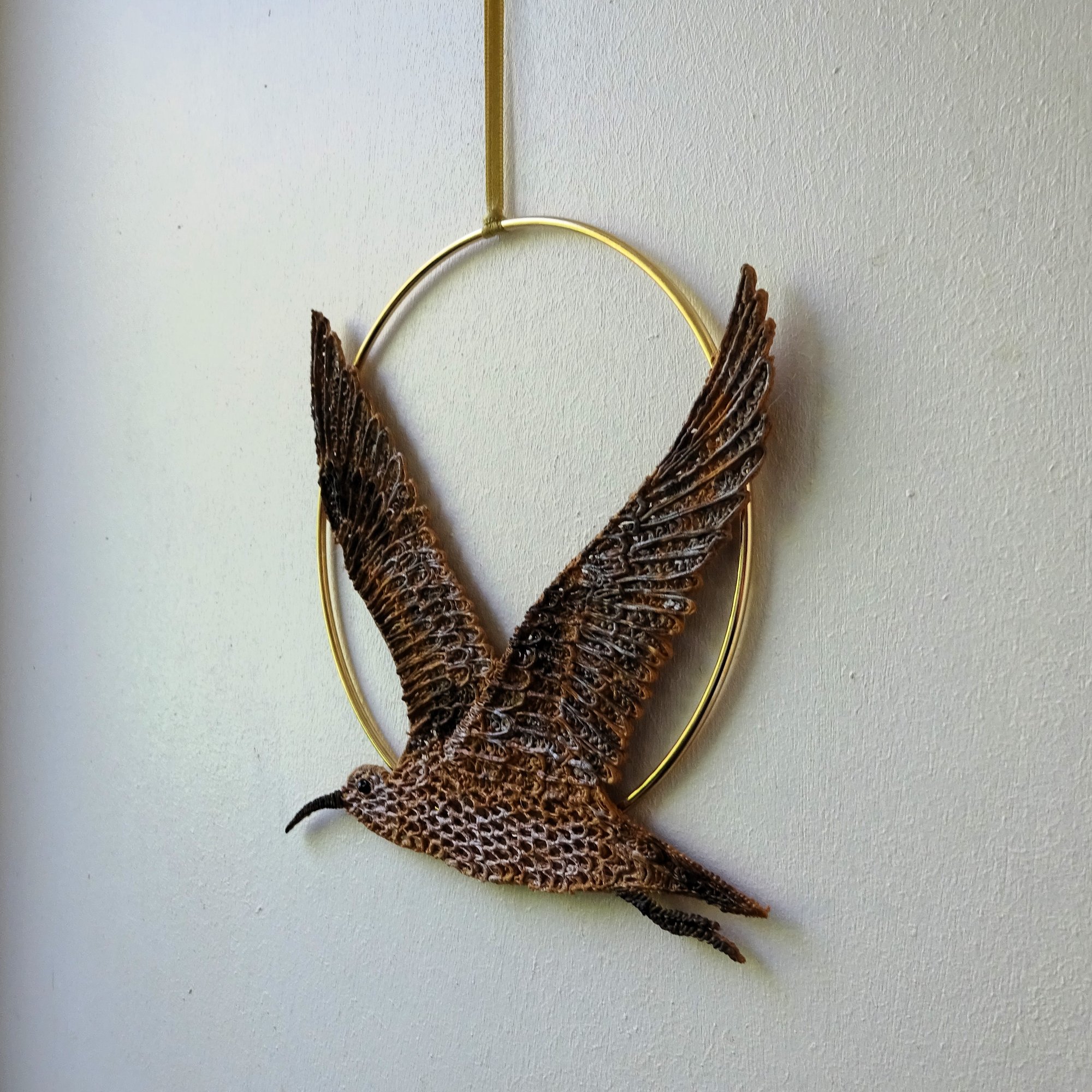 This flying curlew was created with a 3D pen and recycled PLA filament. The bird has been securely attached to a gold metal hoop which measures 15cm.