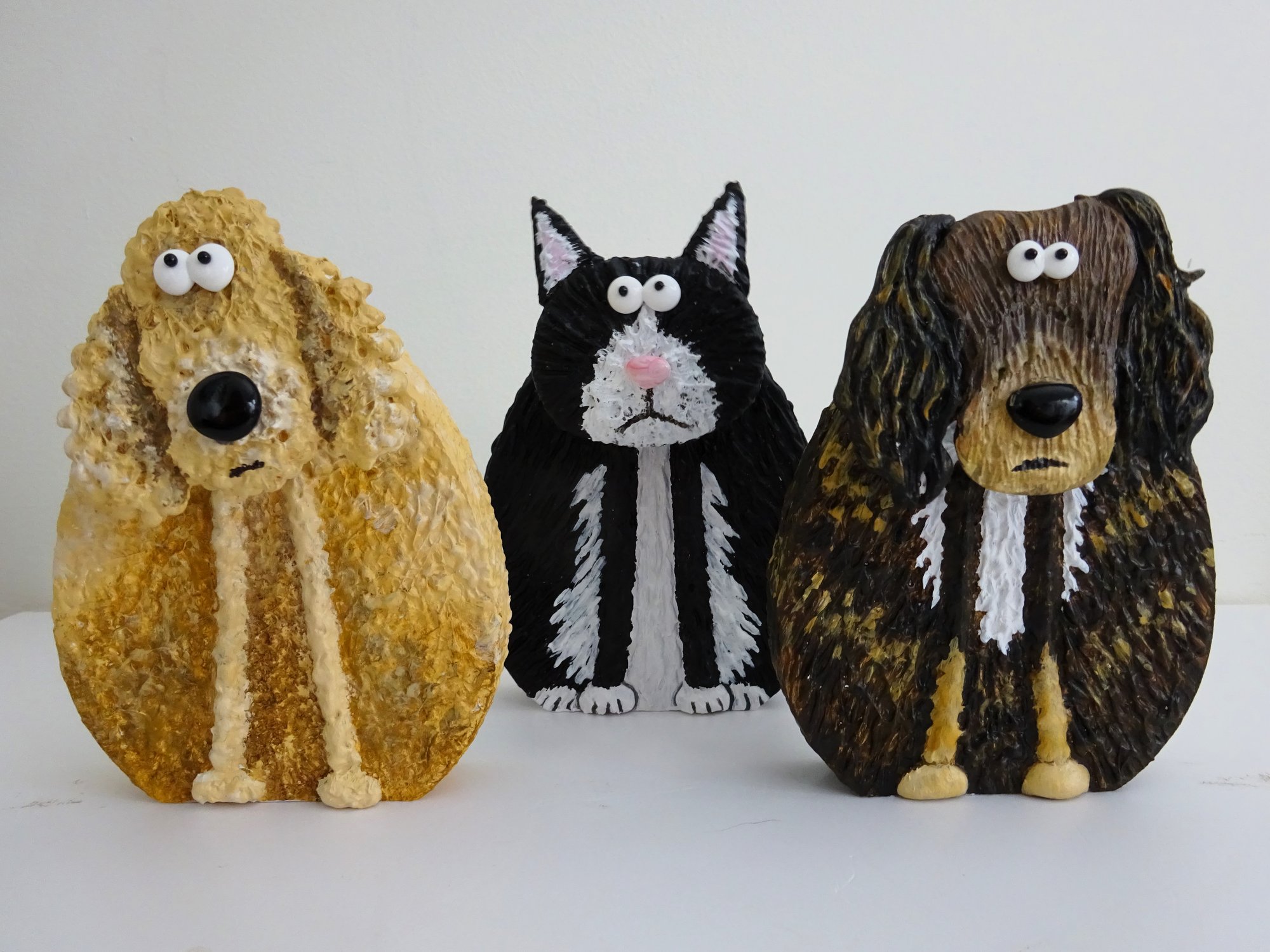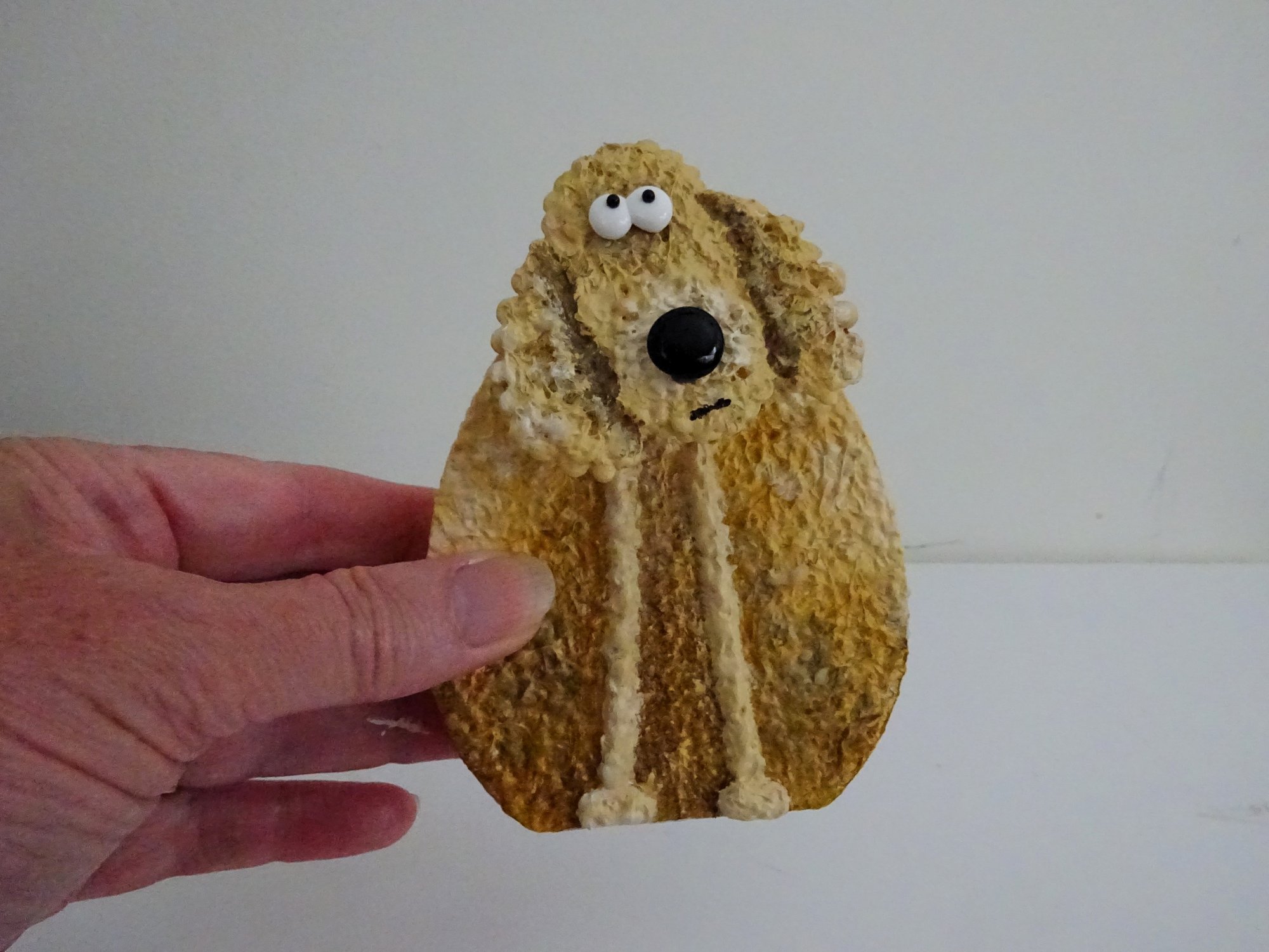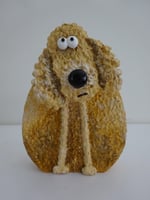 This freestanding delightful dog has a wooden body and a sculpted head on a spring so it nods and wobbles. I've added lots of texture (fur) and hand painted the sculpture with acrylic paint. The 3D eyes give a humorous look to the piece and a keyhole hanger on the back means that you have the option to display it on your walls.