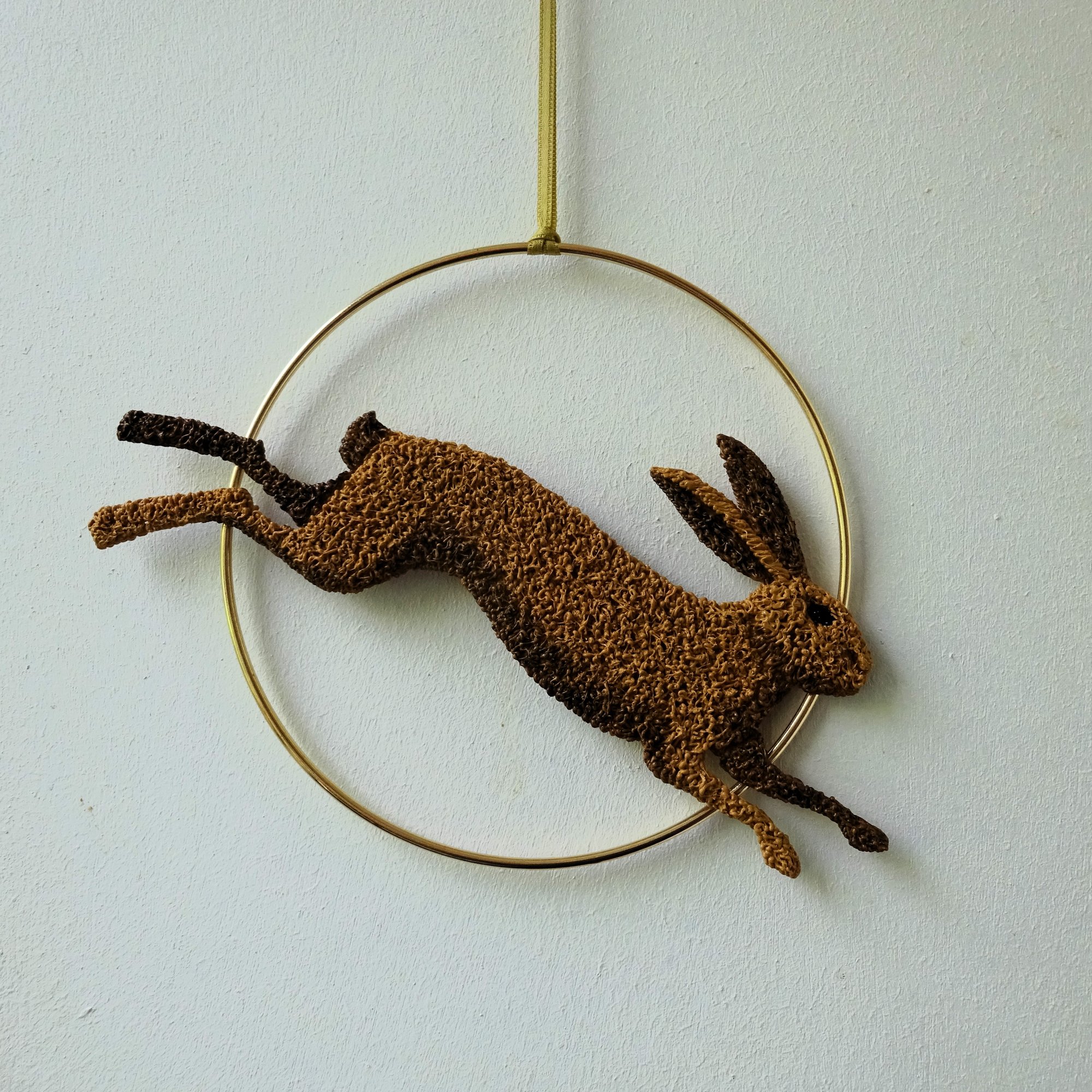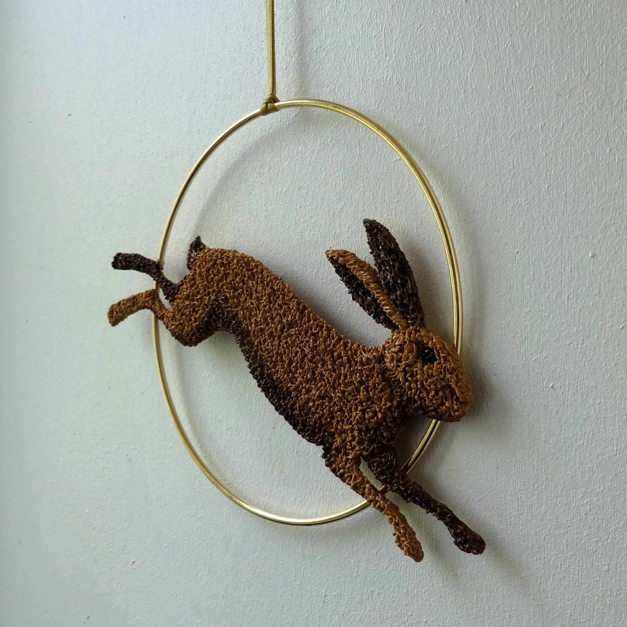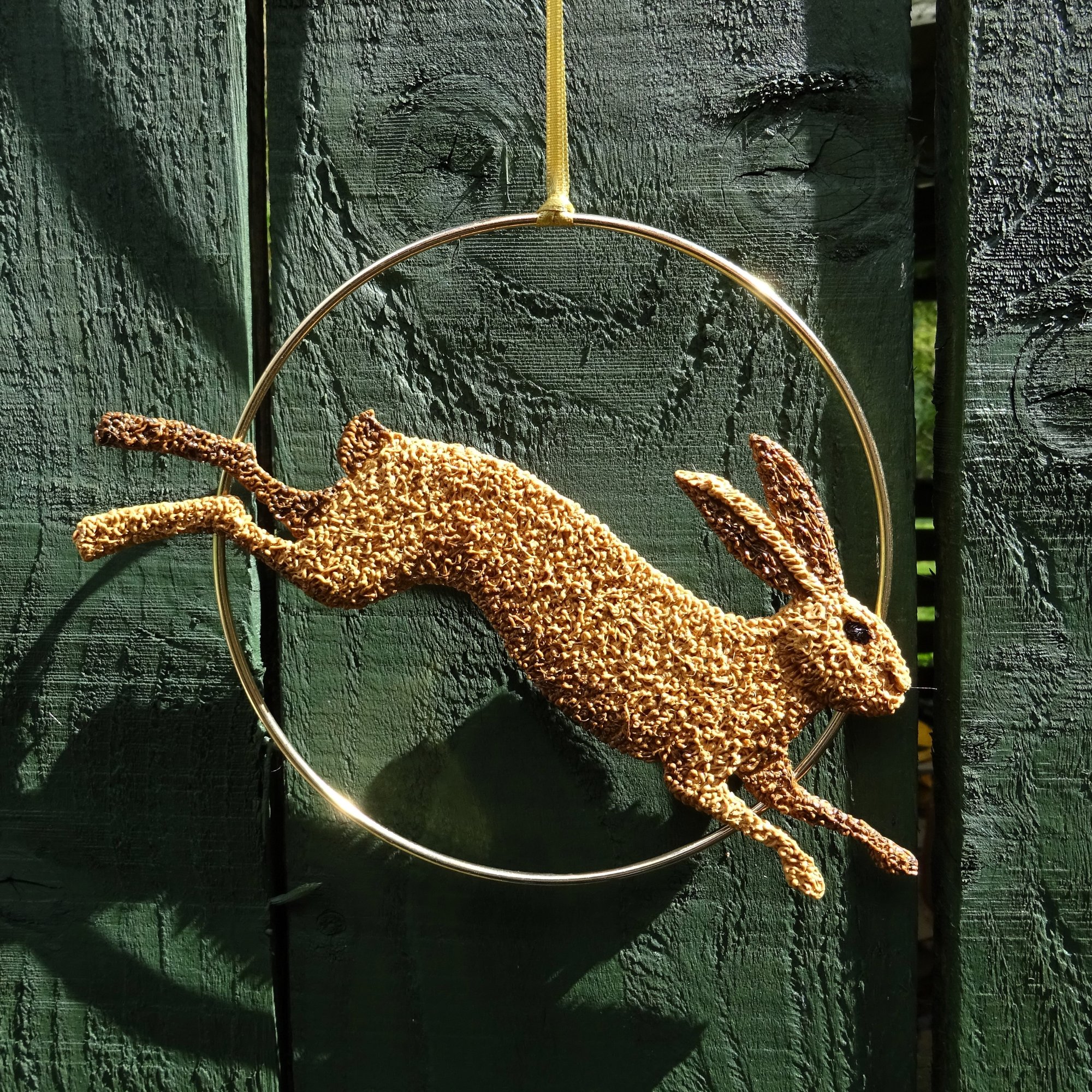 The hare has been securely attached to a gold hoop and finished with ribbon.
