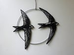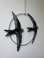 When the birds are complete, they're attached to the metal hoop with thin black wire.