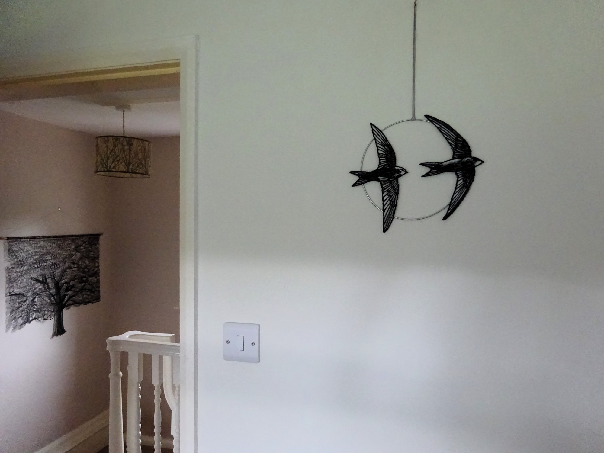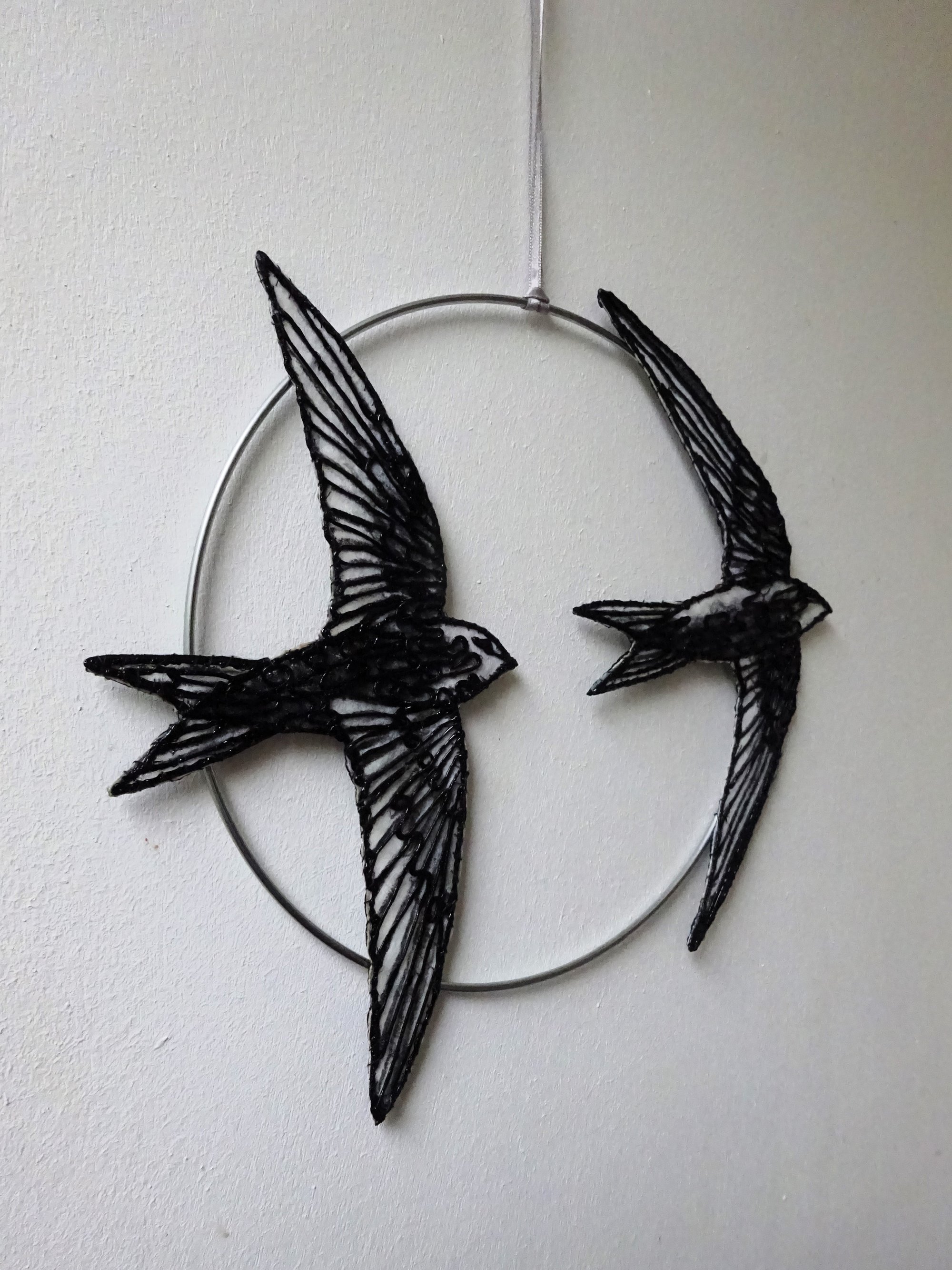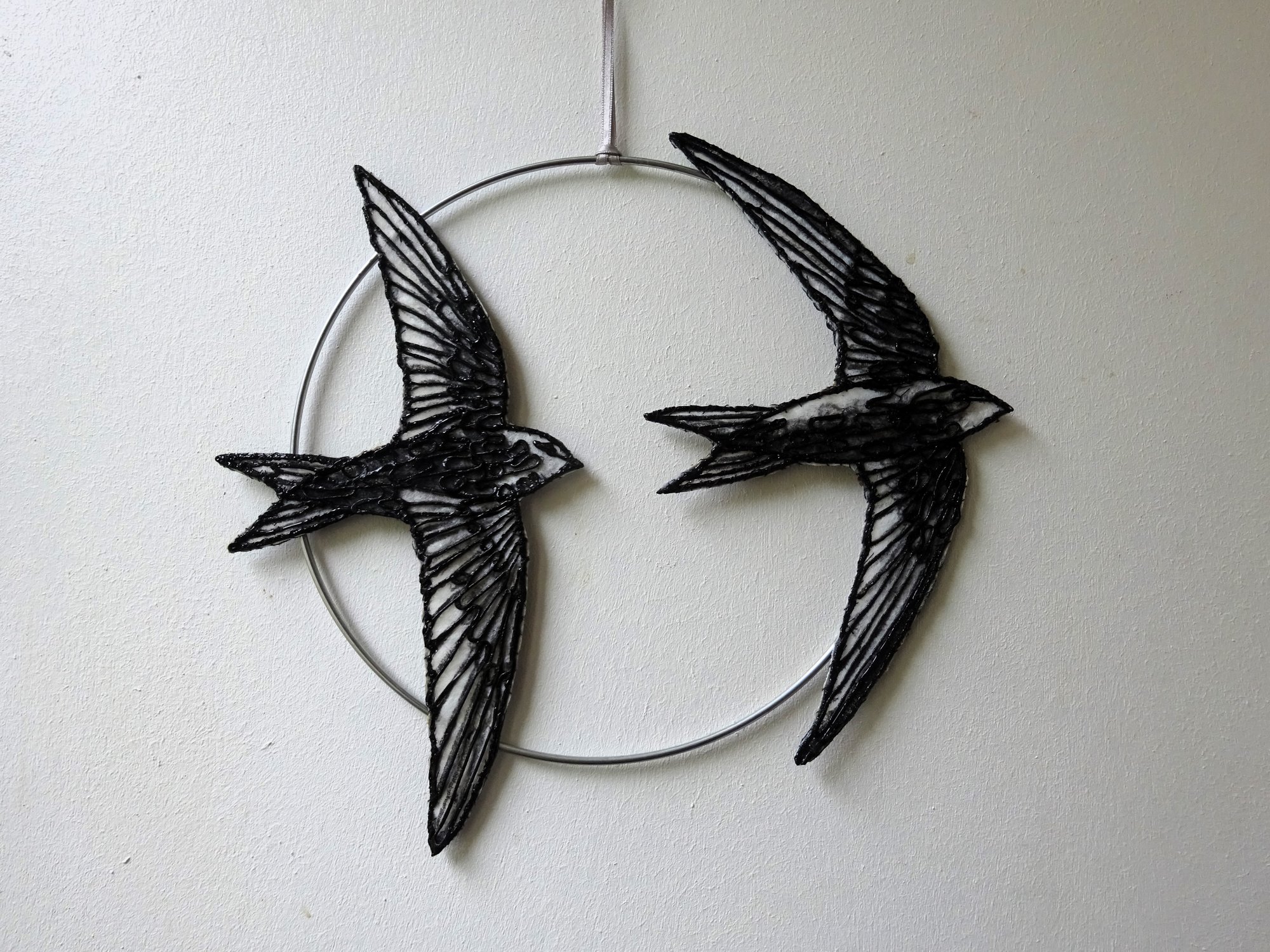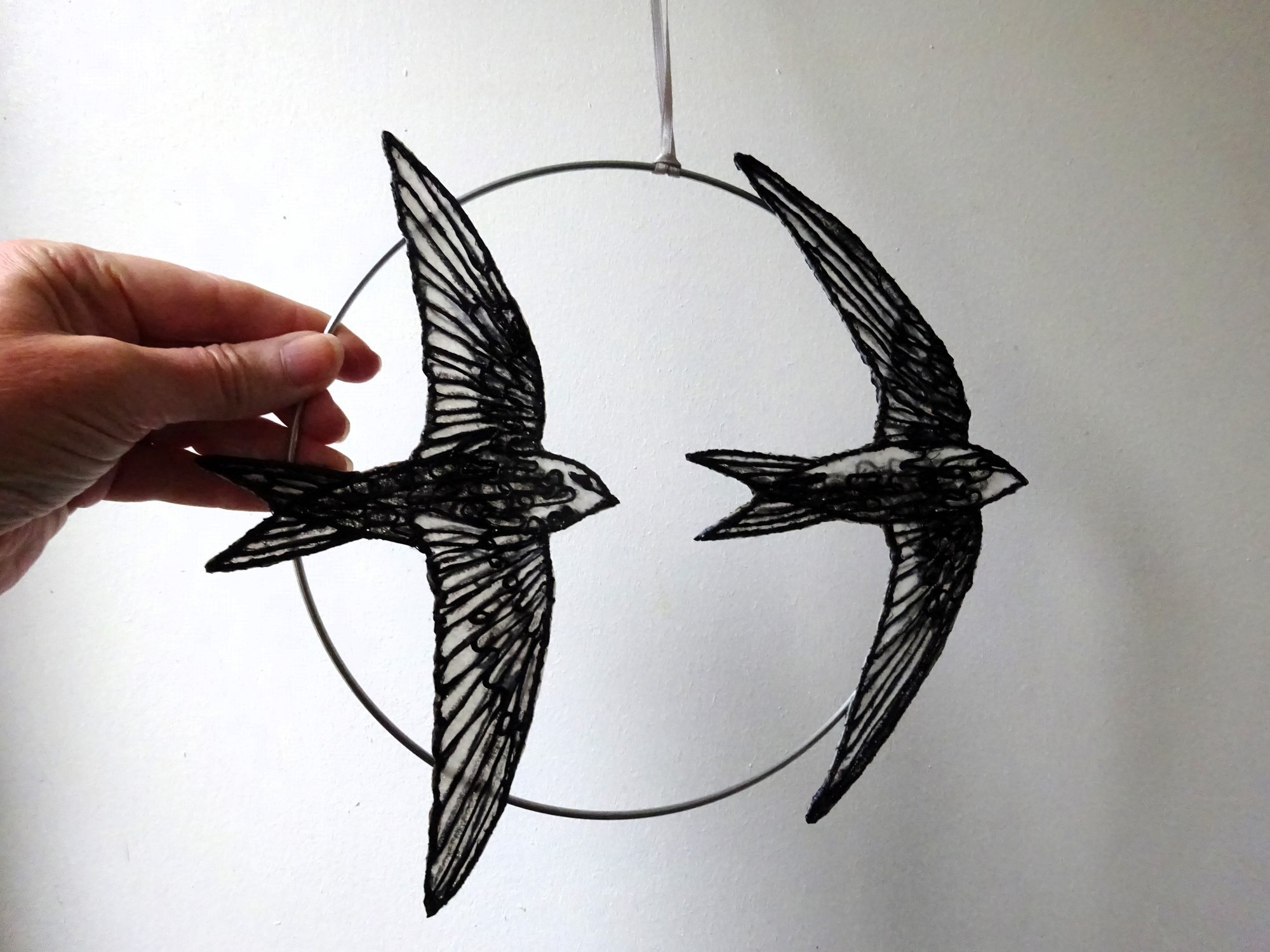 These swift birds were made with a 3D Pen and lutradur fabric. The black filament used in this piece has been made from recycled plastics. If you're not sure what a 3D pen is then I'll let AI explain.