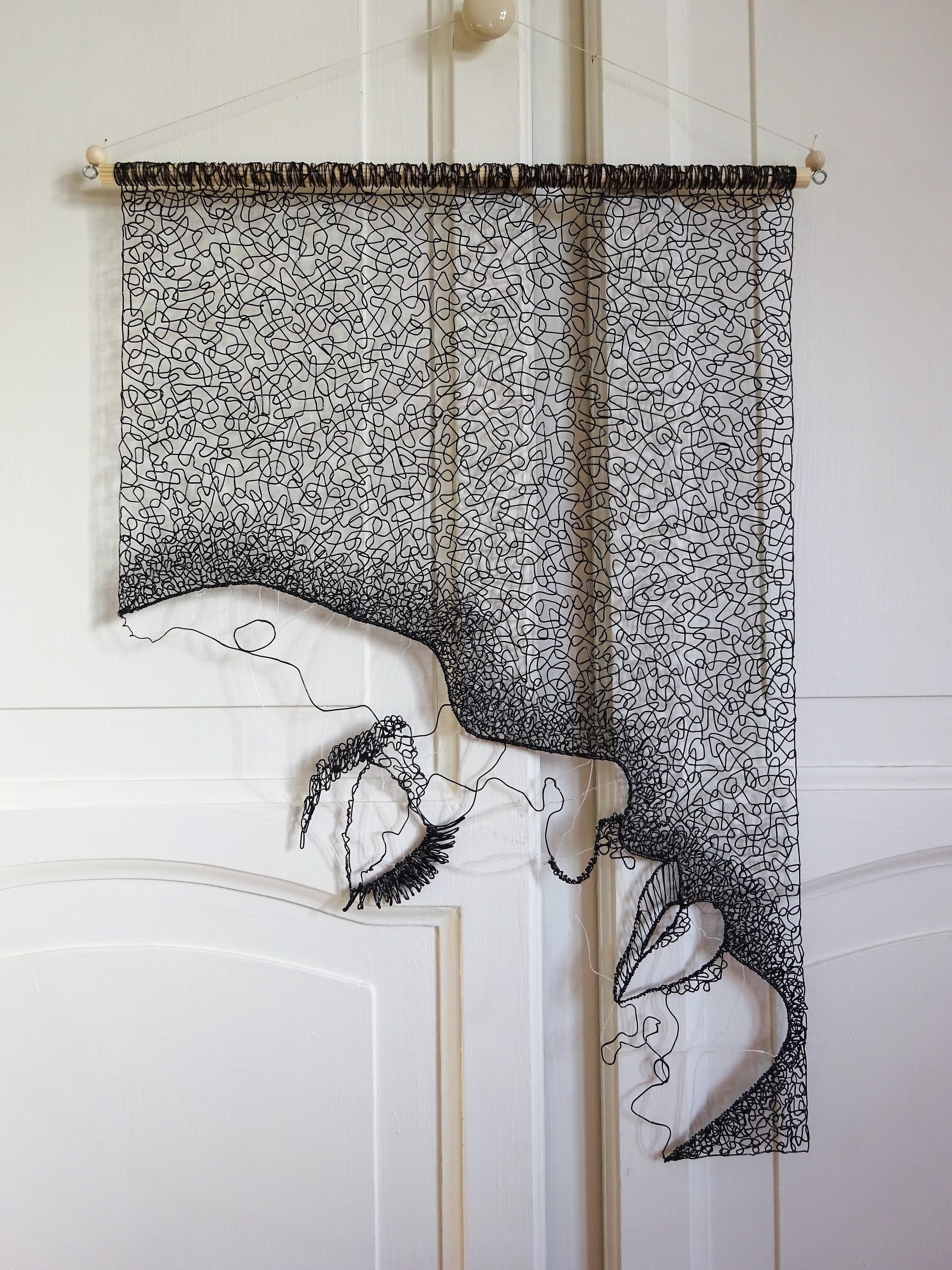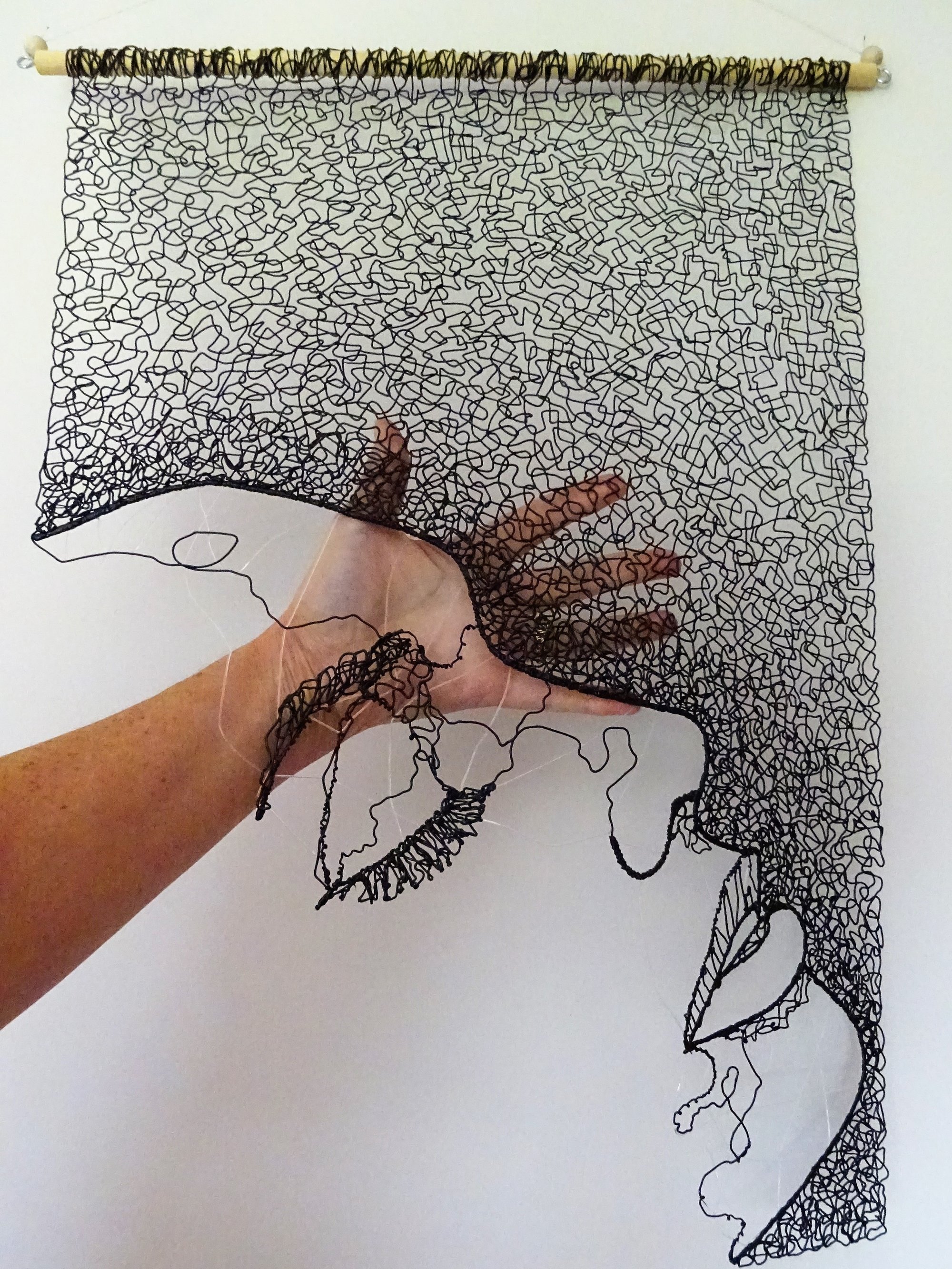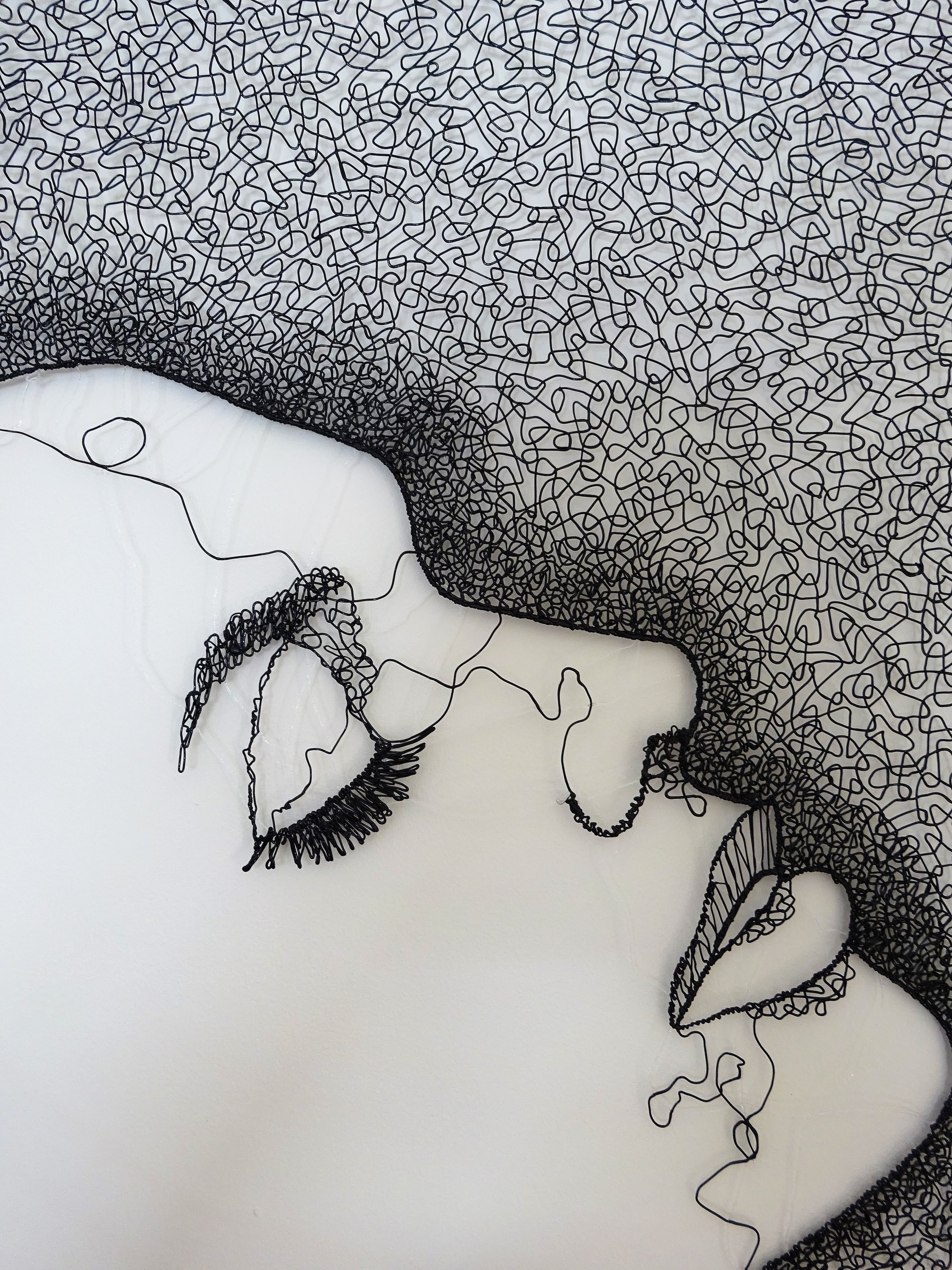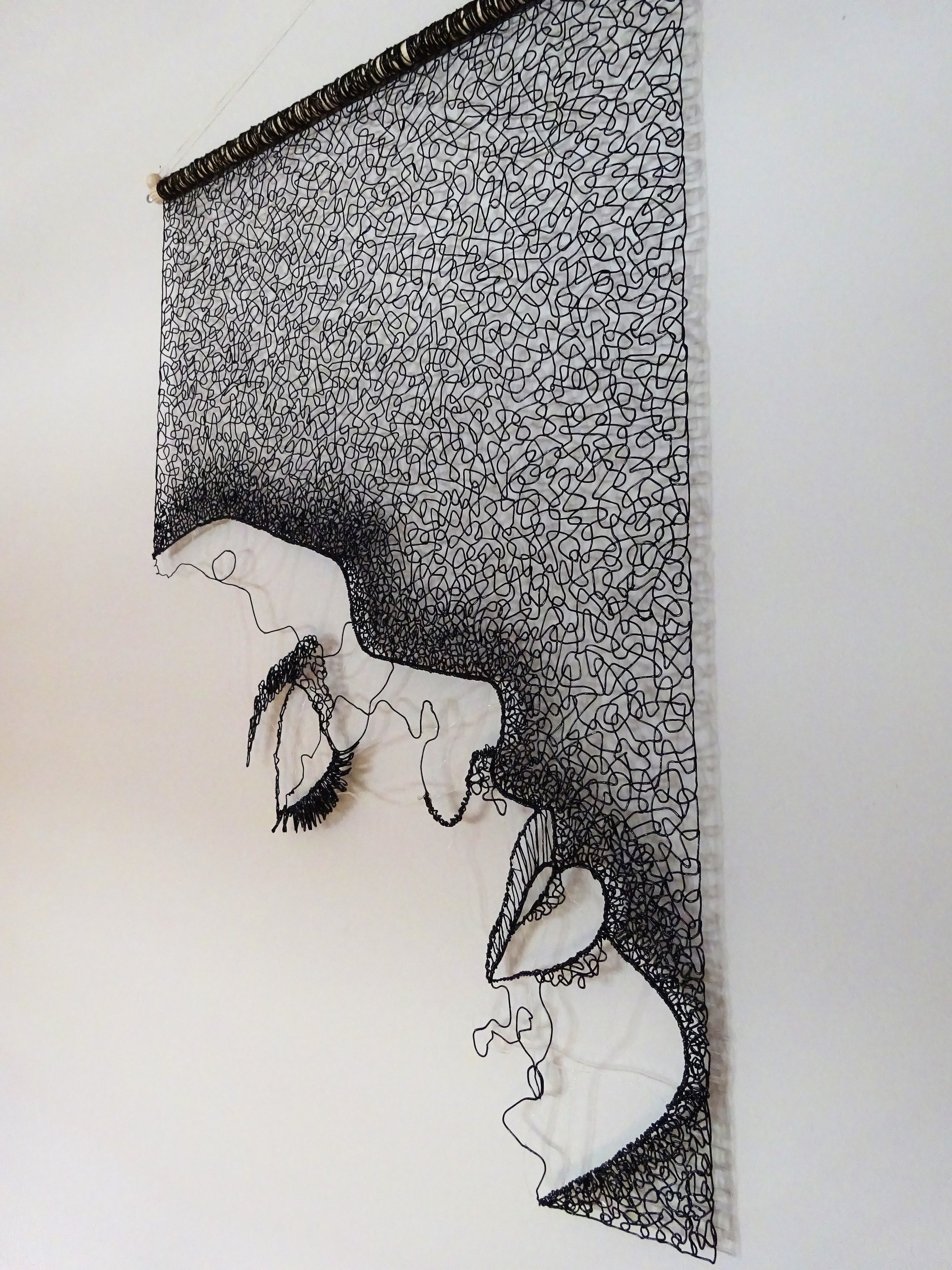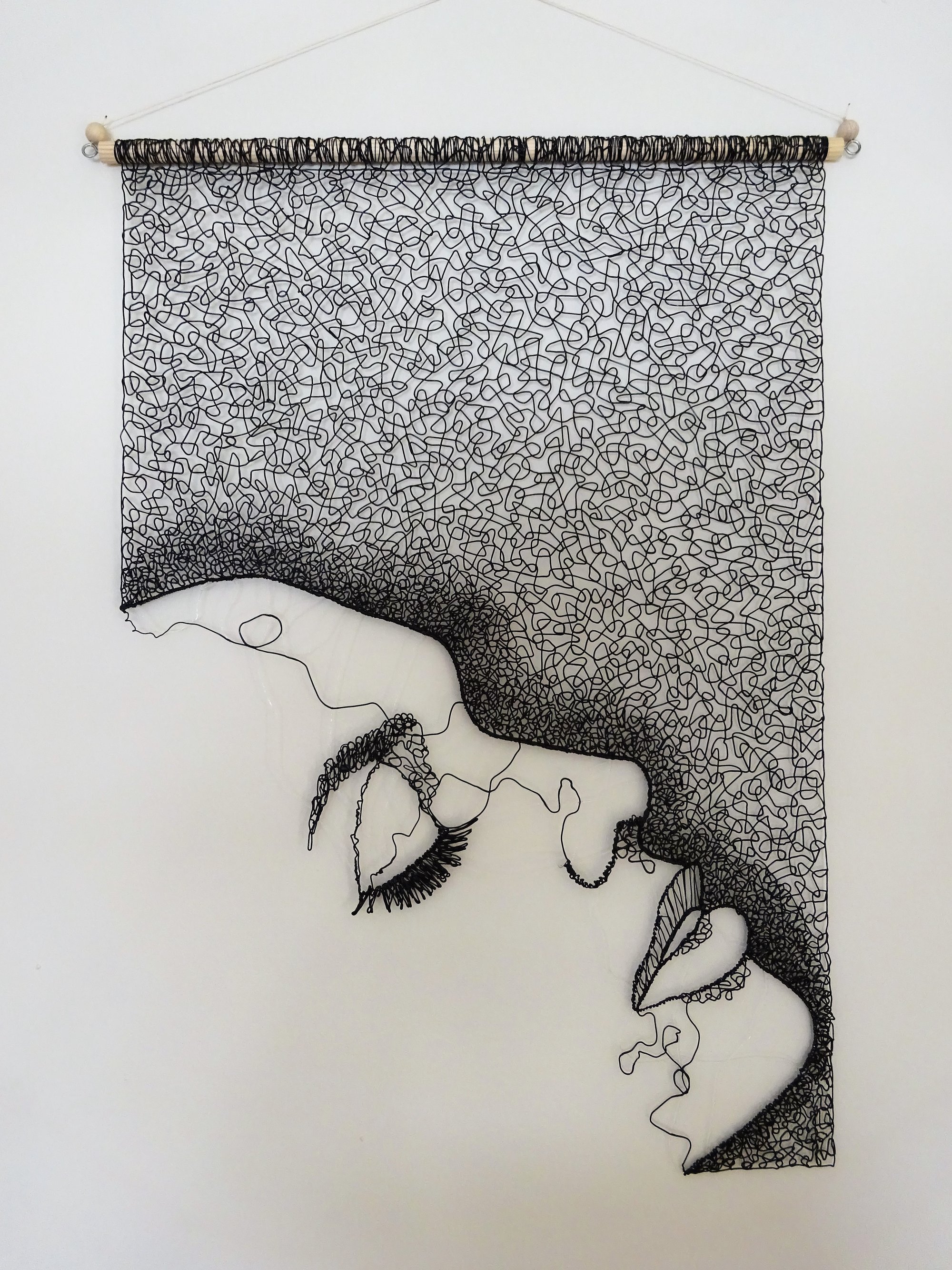 Working with a 3D pen is literally drawing with plastic. This design features a woman's profile (negative space) with minimal lines to suggest the features. Loops of the flexible TPU filament have been worked into an abstract lace pattern. The piece is hung from a wooden dowel and measures 60cm in height and 42cm in width.