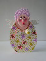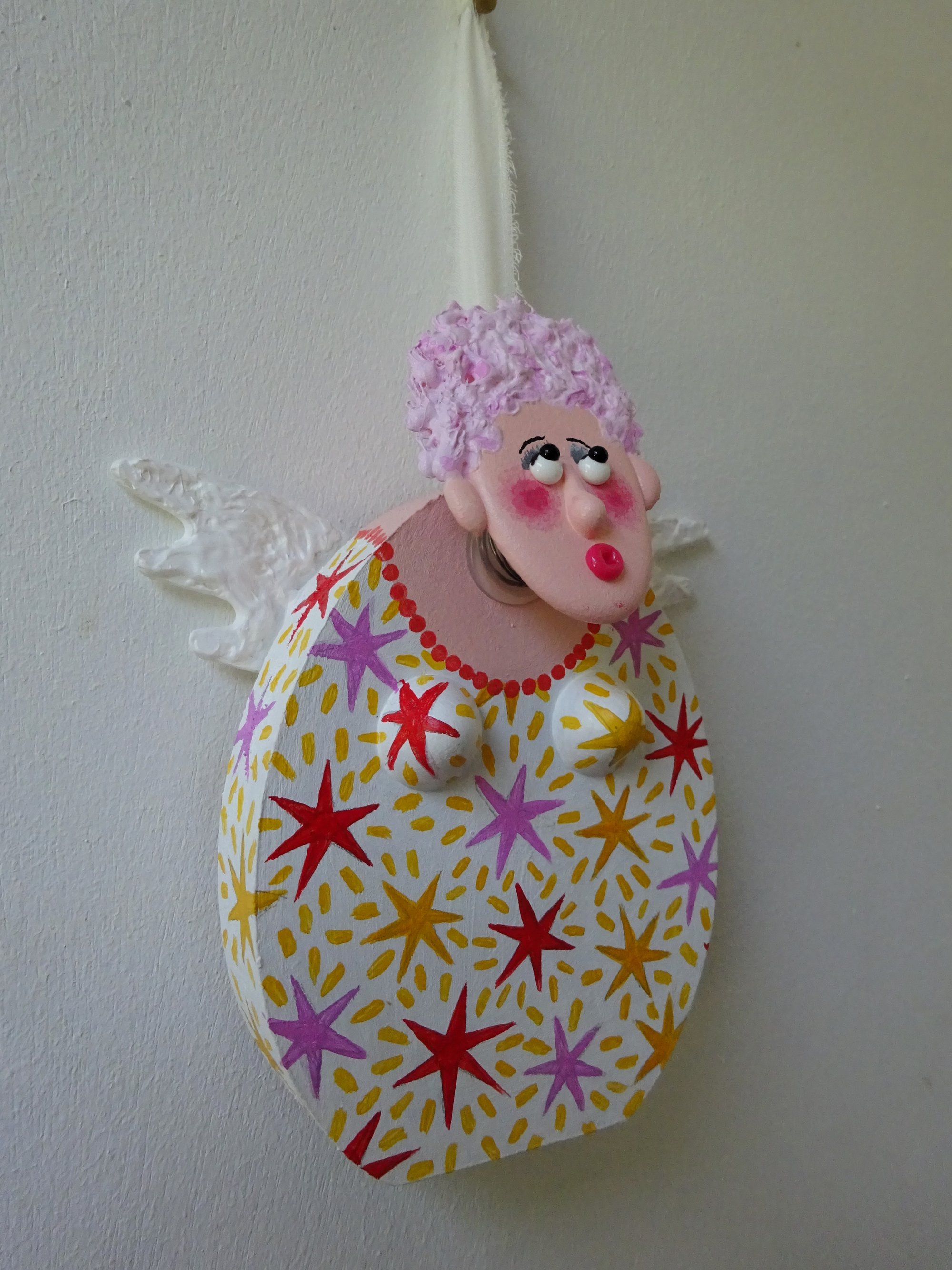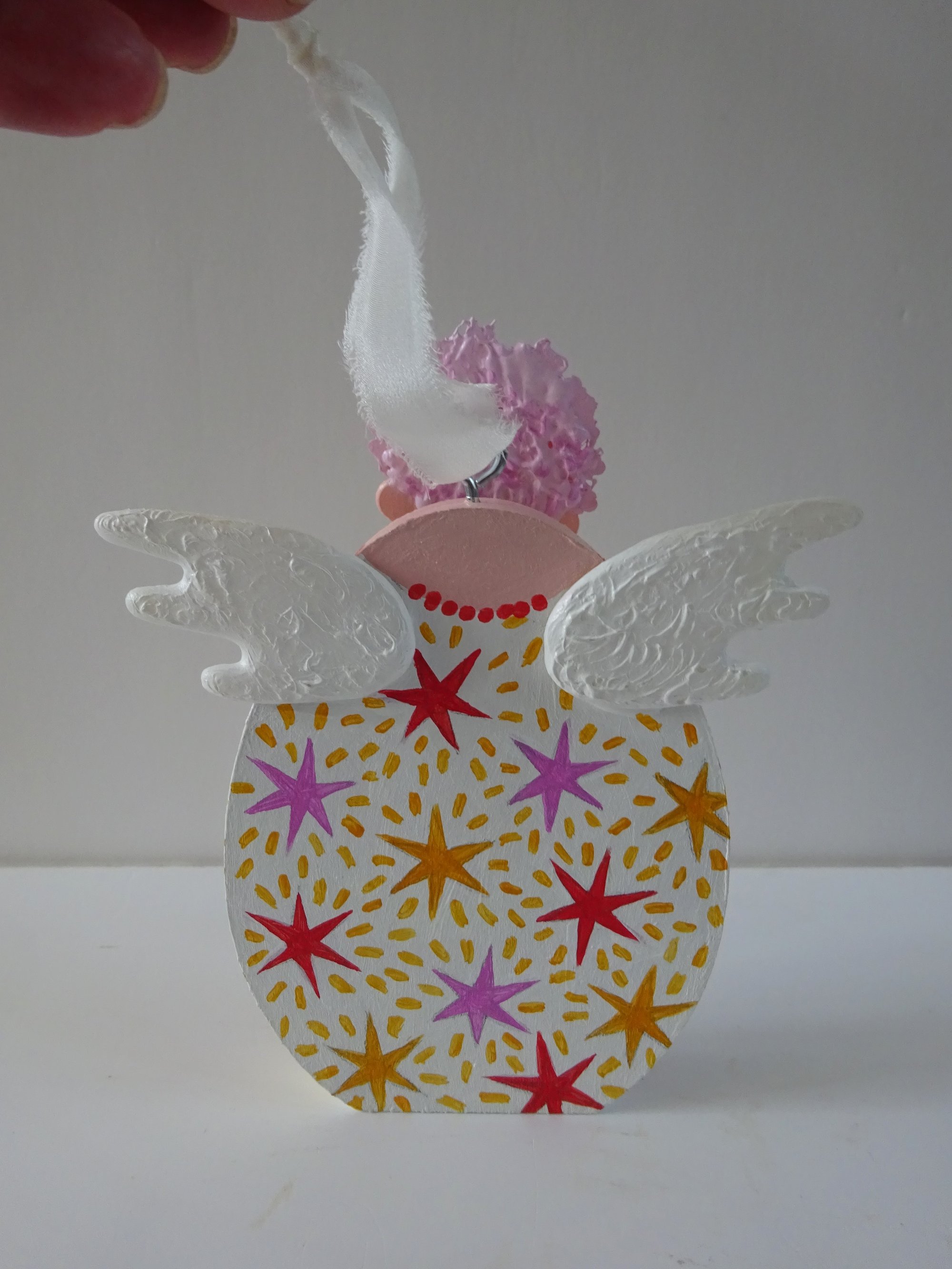 My hand painted angels are freestanding but with the addition of the ribbon they can be hung on a wall or a tree. Unlike the Wensley Dames, the design on the dress continues around the back.