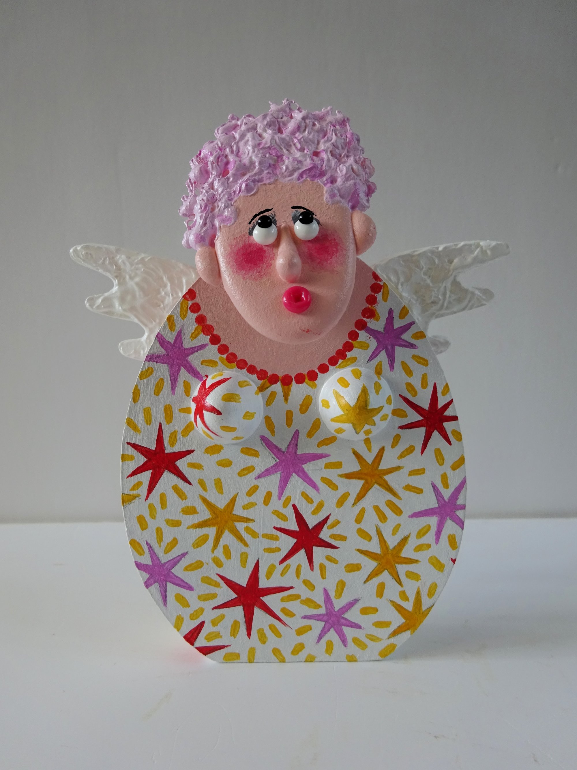I've named this one Estelle and she has a bold and colourful pattern of stars on her dress and pink hair.